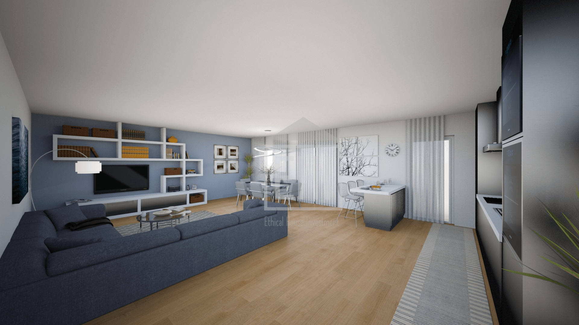 L'appartamento è così strutturato: soggiorno con cucina open space, disimpegno, due bagni finestrati, ripostiglio, tre camere, due ampi balconi dalla superficie complessiva di circa 58mq.